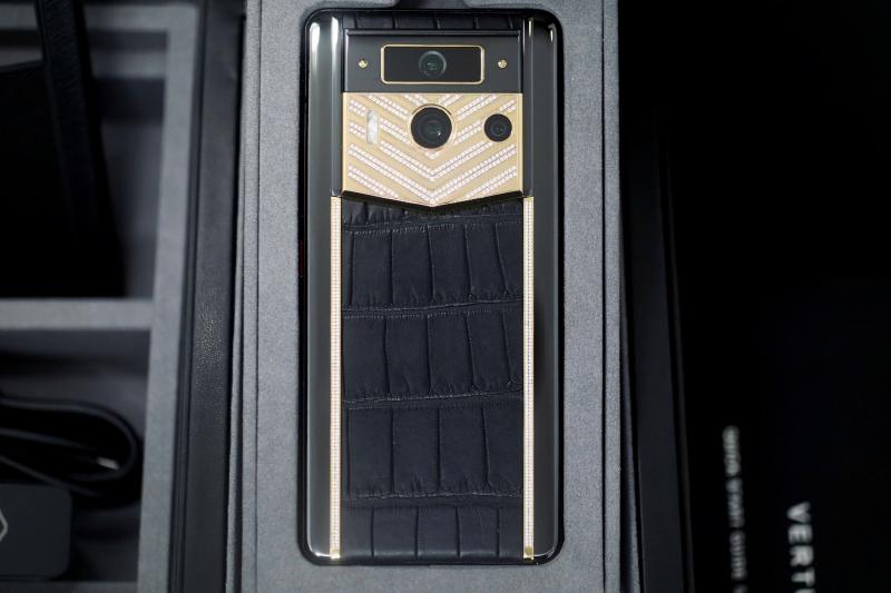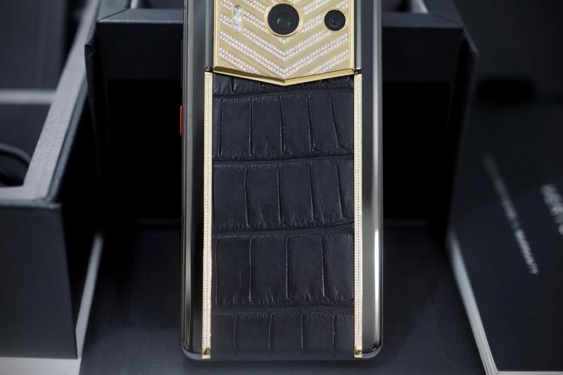 Mặt lưng của điện thoại được làm từ da cá sấu cao cấp nhập khẩu, chất liệu quý hiếm và sang trọng, kết hợp với những chi tiết điểm vàng đính kim cương đã đem đến sự sang trọng, độc đáo dành cho các quý ông thời thượng.