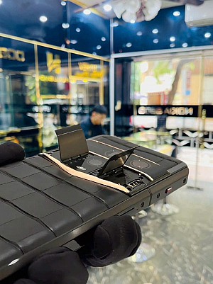 Ngay khi cầm trên tay Vertu Agent Q Black Premium Set Single Gold Accent Iron Black Alli 1TB, người dùng sẽ cảm nhận được sự đẳng cấp đến từ lớp da cá sấu liền mạch bao trọn thân máy, mang đến cảm giác mềm mại nhưng vẫn đầy chắc chắn. Bộ khung Falcon-Wing chế tác từ thép không gỉ kết hợp cùng bản lề chuẩn Thụy Sĩ giúp từng thao tác mở – đóng trở nên mượt mà, bền bỉ theo thời gian.