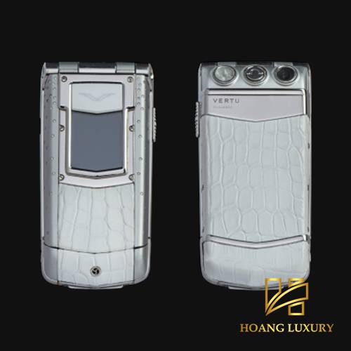 Vertu Ayxta da cá sấu trắng kim cương sinh ra là để dành cho những quý ông đẳng cấp, những quý bà sang trọng bởi chiếc áo choàng màu trắng thanh lịch đến từ lớp da cá sấu mềm mịn, độc nhất vô nhị. Hơn thế, máy còn được gắn kim cương lấp lánh, góp phần tôn vinh lên vẻ đẹp sang trọng của chủ sở hữu. Thêm vào đó, màn hình và phím bấm được làm từ Sapphire, có khả năng chống xước gần như tuyệt đối trừ kim cương. Và vẫn là huyền thoại Ayxta khi thao tác đóng mở máy hoàn toàn đơn giản, dễ dàng nhờ hệ thống lò xo và chốt cầu thép không gỉ, bàn phím điêu khắc tỉ mỉ cùng hệ thống chiếu sáng âm phím xuyên thép tạo hiệu ứng vô cùng độc đáo mà hiếm có một sản phẩm công nghệ nào có thể làm được đã biến Ayxta thành một kiệt tác nghệ thuật bất chấp không gian và thời gian. Nếu như Vertu Signature S thành công trong hệ phím bấm thì đây cũng là dòng sản phẩm cực kì được yêu thích trong kiểu dáng nắp gập